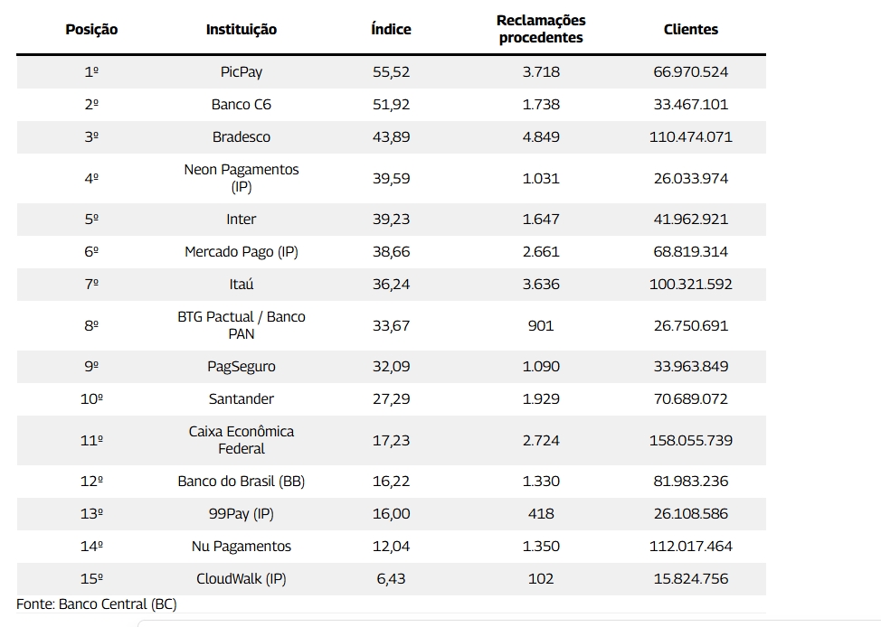 No período, o PicPay liderou o ranking proporcional, com 3.718 reclamações procedentes, o que resultou em um índice de 55,52 queixas por milhão de clientes, o maior entre as instituições avaliadas. Em seguida, aparece o C6 Bank, com 1.738 reclamações e índice de 51,92. O Bradesco ficou na terceira posição, com 4.849 queixas procedentes e índice de 43,89.